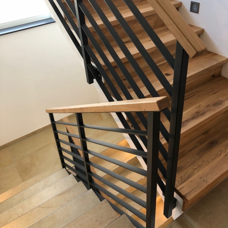 Treppengeländer mit waagerechtem Flachstahl, pulverbeschichtet mit Holzhandlauf, Wald